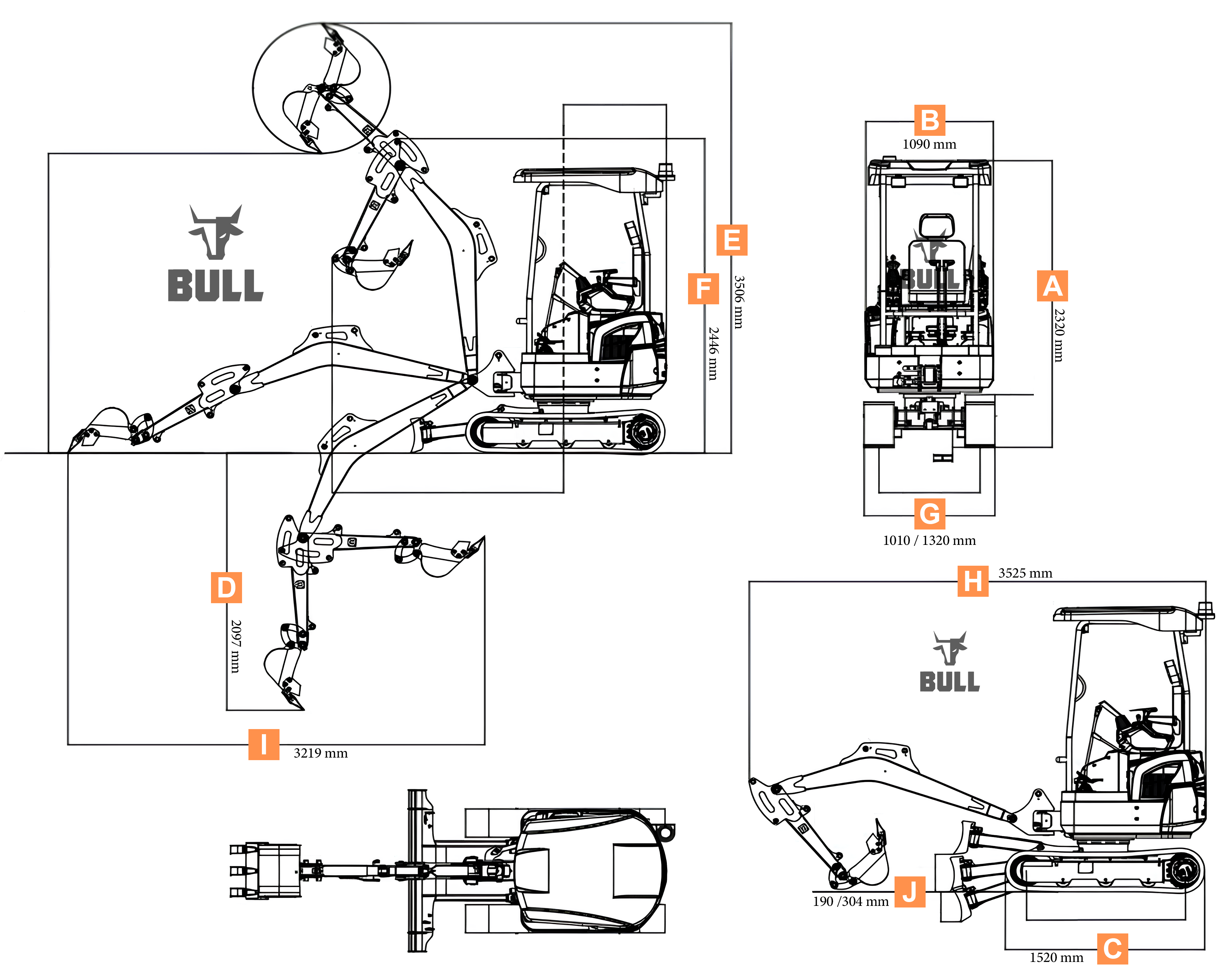 Descubra la mini excavadora BULL en diferentes configuraciones y situaciones, ángulos de trabajo, equipos, detalles técnicos y usos en el terreno.
